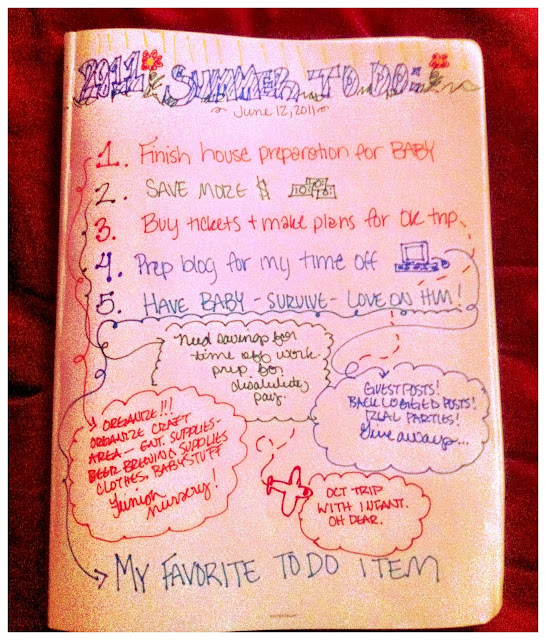 1. Finish House Preparation for Baby I know I have been talking about baby a lot lately but, really, that is the BIGGEST thing going on in my life right now. I have SO much to do in preparation for the baby including re-organizing my craft and entertaining areas, finding a good storage and work area for my husband’s beer brewing equipment, clearing out our guest closet, baby proofing house and finishing the nursery. Have I mentioned he is due in 2 months!?! 2. Save more $$$$ Well, this is a no-brainer. Babies are expensive and I will not be working for three months and then be going back to work very part time… we need a little bit more of a cushion than we have now. Simple as that. 3. Buy tickets & Make plans for Oklahoma trip My family live in Oklahoma… last year my grandmother (one of the most amazing women on this planet) suffered a stroke and can no longer travel. If there is one MUST DO it is to bring my little man to meet her and my grandfather as well as the rest of the fam. Traveling with an infant seems incredibly daunting to me (not to mention the cost of traveling after having said baby). So, I need to get on this task/goal pretty quickly. 4. Prep blog for time off— This goal is essential… I am having SO much fun blogging and it has turned into an amazing space for me to share creatively. But, I am NOT so good at being pregnant and keeping up with blogging, so I fear having an infant and blogging. I’m lining up people for guest posts and working on some scheduled posts that will run when I am not able to blog. Currently I blog very in the moment so this is a toughy. I do have some fun GIVEAWAY opportunities that I am getting excited about so hopefully that will help keep the blog a runnin’. BTW- IF YOU ARE A BLOGGER AND WOULD LIKE TO SHARE A GUEST POST PLEASE GET IN CONTACT WITH ME!!! 5. Have Baby. SURVIVE. Love on Him!— This is my favorite of my goals for several reasons… one of which is that I really don’t have to work too hard to make this one happen now. He is a comin’! I’m scared of birth and of hospitals, so that part will be some work. Loving on him is the one thing I’ve been dreaming about the most these past few months. I think the hard part about this will be to do anything other than love on him.