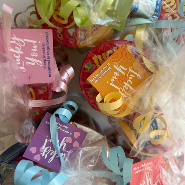 Directions: Add the cereal and milk to the bowl and stuff some tissue paper beneath/behind the items (my items barely fit so the tissue helped to stabilize them). Tape the spoon into the bowl so that it stands upright. Add entire bowl into cellophane bag and tie with ribbon. Attach tag and make curls with the ribbon!