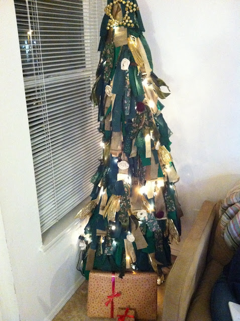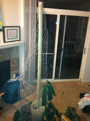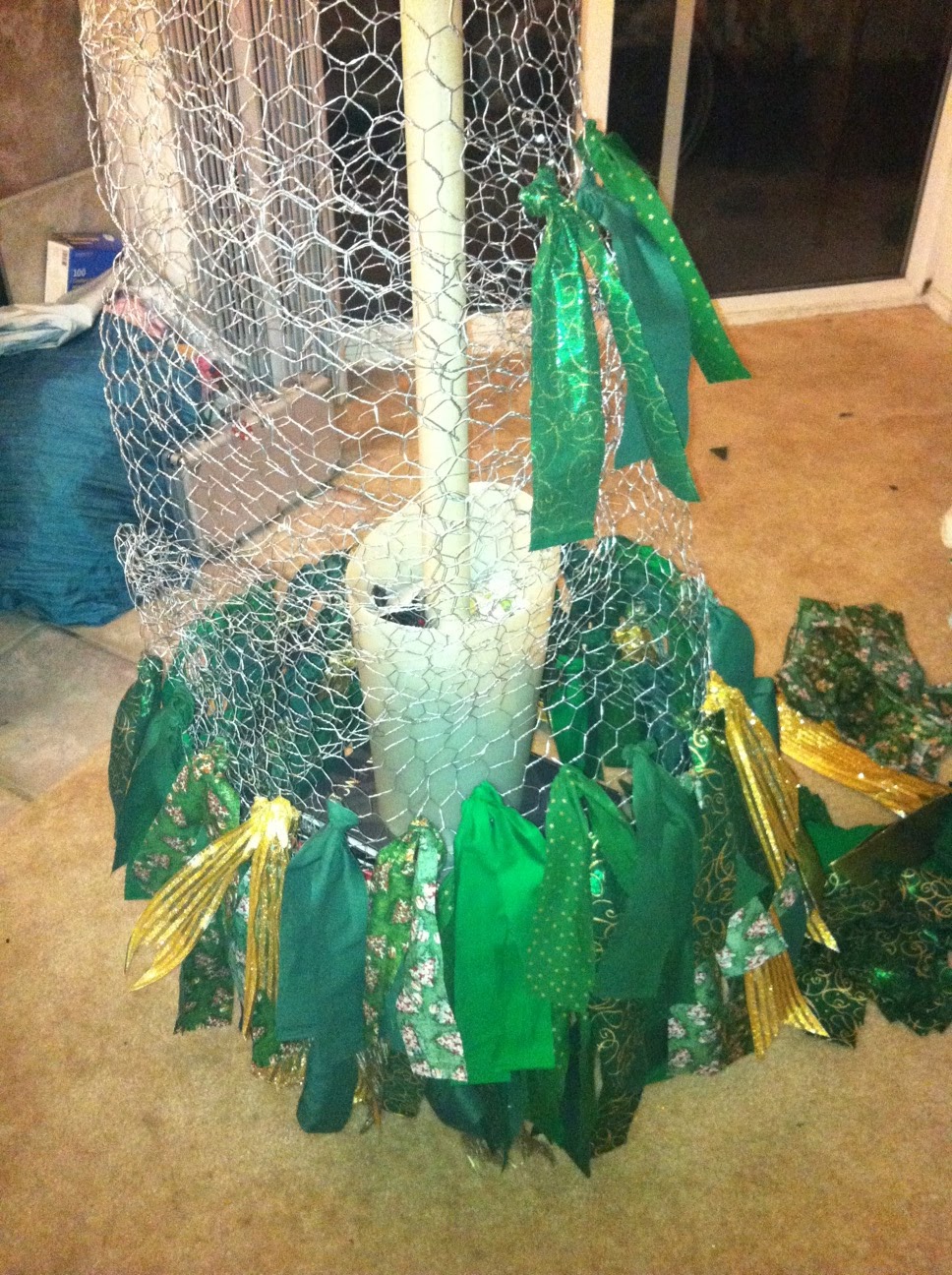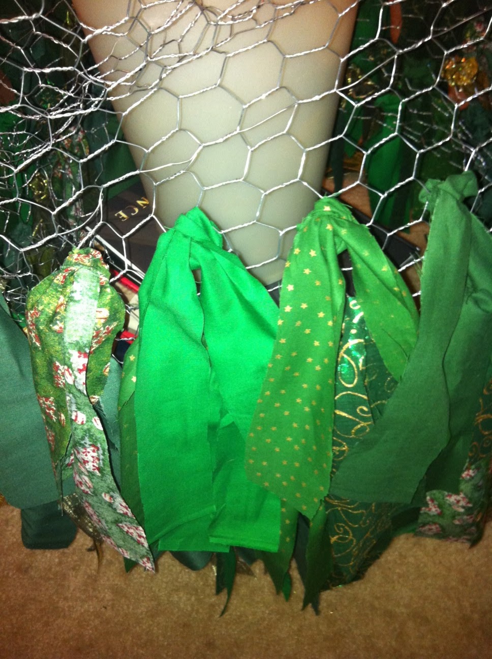 Tie fabric strips onto chicken wire skipping some of the holes so that the fabric lays nicely.