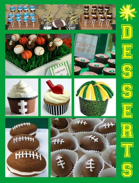 Marshmallow pops in team colors from Celebrations At Home, Touch Down Brownies from Celebrations At Home, three cupcakes in the center (football, referee, pom pom) featured on Hostess Blog and originally from Celebrations.com, Football truffles from Maybe Strawberry , Football Whoopie Pies from Make Merry Events, Sport Cake Pops and